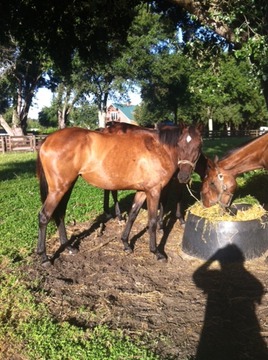 These are the three fillies we will follow. They are between 25 and 27 months old. The are still immature looking. They are like teenagers. So they have been getting taller and starting to fill out. They were all broken and ridden a little early this year and then have been turned out to grow. They are put on the Eurociser about twice a week and jog in both directions about 20 minutes with some equipment. The footing is sandy so I hope that they are starting to "discipline" their muscles to do some work. In September we should start riding them. Our hope is to have them racing before the end of themeet in Tampa Bay Downs.